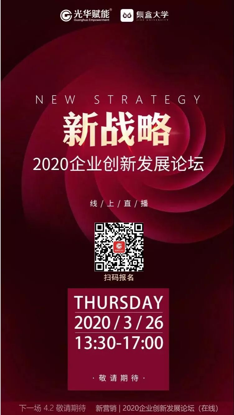 當今世界瞬息萬變,永恒不變的就是“變化”。應對變化,只有不斷創新,企業才能求得長遠發展。由杭州光華賦能科技有限公司舉辦的《新戰略??2020年企業創新發展論壇》線上直播活動,將于2020年3月26日13:30-17:00進行。