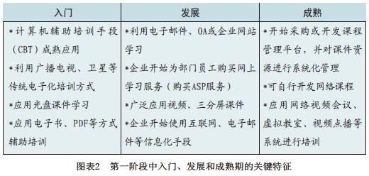 企業e-Learning成熟度模型的第一階段是電化培訓階段。該階段中e-Learning應用方式是利用電視錄像、VCD/DVD光盤、網絡視頻等。緩解培訓壓力、降低培訓成本是該階段e-Learning應用的直接驅動力。同時,e-Learning課程多為從傳統培訓或講座轉換的視頻課件,一般沒有培訓評估也沒有專門的學習或培訓管理平臺。同步教學系統或虛擬教室實時傳輸的e-Learning方式也屬于該階段,是一種粗放式的e-Learning應用階段。第一階段e-Learning應用主要由培訓部門主導,大型企業通常由電化教育中心負責推廣實施,而中小型企業通常由培訓專員兼職負責(見圖表2)。