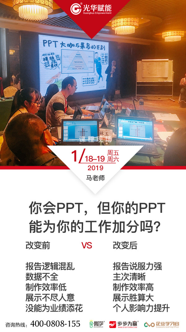 還在為年度報告愁眉苦臉的職場精英們,有光華在一切不用愁!2019年1月18-19日,光華高級講師馬建強老師在杭州書香世家酒店獻上精彩的公開課程《職場高效辦公Office速成--PPT年度總結報告完美呈現》,手把手教你做能為你加分的PPT!