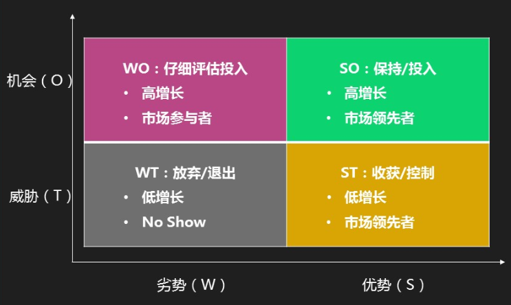 可以借助經典工具SWOT。O代表我們所處行業的機會,T代表威脅,是指讓我們所處行業的吸引力降低的那些趨勢。S代表在某個行業關鍵成功要素上和對手相比的優勢,W代表劣勢。所以市場被切分為四塊,市場洞察最核心的是要能夠針對不同細分市場,制定不同的策略和目標。SO領域通常要做絕對的市場領導者,甚至要立志打殲滅戰,我們往往要求高增長,通常是三倍于行業的增長速度。WO市場是要聚焦,選擇一個細分市場來切入,集中優勢兵力實現快速增長,然后再逐步滲透。在ST市場,別人在蠶食我們的根據地,而增長的機會不多,少投入一些資源,保證份額跟市場的增長持平;在WT市場,可以選擇策略性退出,把資源投入到機會領域。