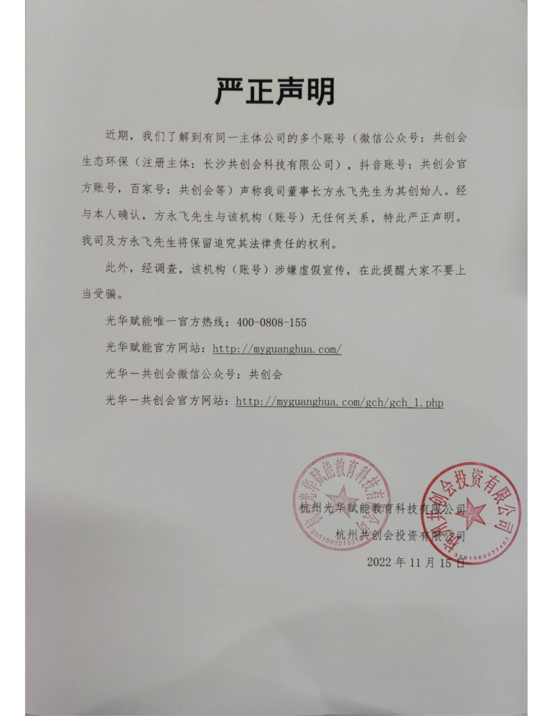 近期,我們了解到有同一主體公司的多個(gè)賬號(微信公眾號:共創(chuàng)會(huì)生態(tài)環(huán)保(注冊主體:長沙共創(chuàng)會(huì)科技有限公司),抖音賬號:共創(chuàng)會(huì)官方賬號,百家號:共創(chuàng)會(huì)等)聲稱我司董事長方永飛先生為其創(chuàng)始人。經(jīng)與本人確認(rèn),方永飛先生與該機(jī)構(gòu)(賬號)無任何關(guān)系,特此嚴(yán)正聲明。我司及方永飛先生將保留追究其法律責(zé)任的權(quán)利。