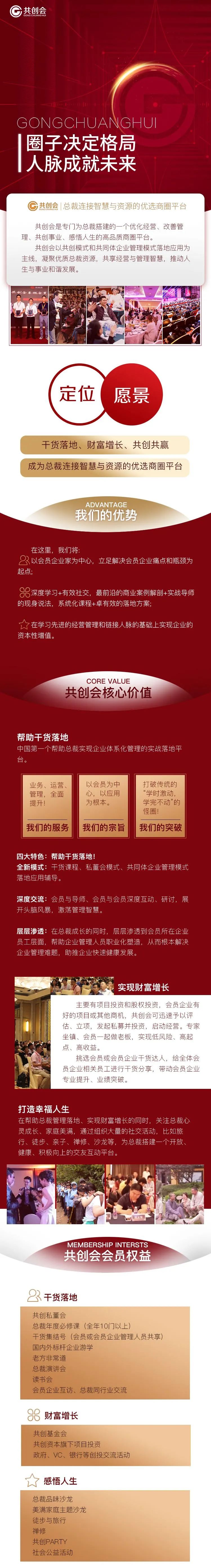 共創(chuàng)會(huì)是專門為總裁搭建的一個(gè)優(yōu)化經(jīng)營、改善管理、共創(chuàng)事業(yè)、感悟人生的高品質(zhì)商圈平臺(tái)。