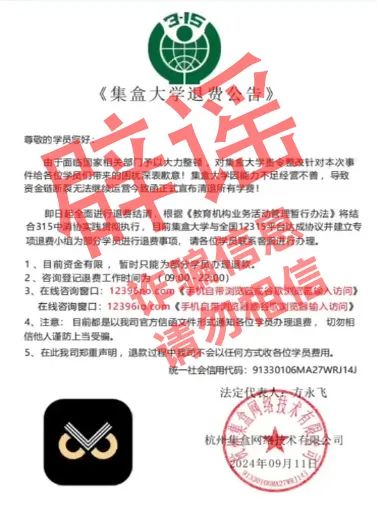 近日,有詐騙集團以“集盒大學退費”的名義誘導學員點擊所謂的退費鏈接,盜取銀行卡、驗證碼等重要信息,或者誘導學員購買所謂的理財產(chǎn)品以騙取資金。